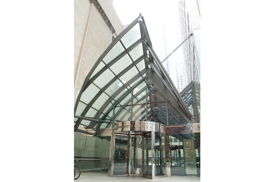Highlights: Building identification on main entrances are waterjet cut, stainless steel, pin mounted graphics. The Site Identification sign is a 48 inch diameter, double sided internally illuminated Commerce Court Logo. Computerized touchscreen directories are kiosk type, built with 3/16 inch thick painted aluminum with pewter metallic finishes and incised acrylic backlit maps. Touchscreen monitors feature removable 3/16 inch transparent bronze tempered glass. Pylon way-finding signs and direction signs are both duracron and stainless steel with aluminum reveals. For the way-finding pylon signs, text graphics are etched/engraved and filled with the arrows being incised 3/16 inch stainless steel. Hanging Signs throughout the underground court are 3/16 inch edge lit acrylic featuring full colour PATH system identification and mounted flush to the ceilings.