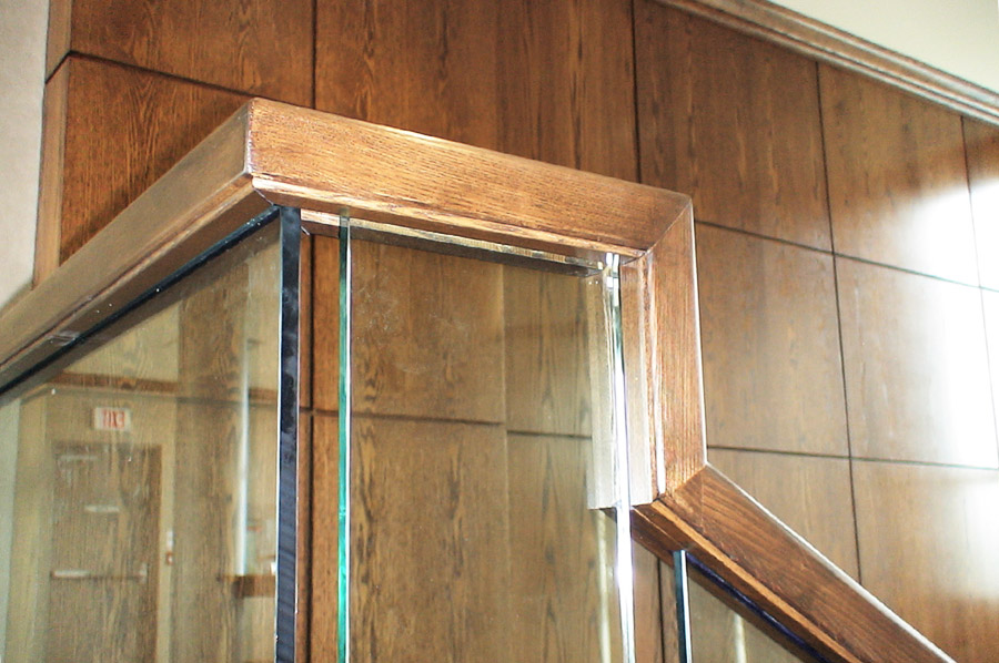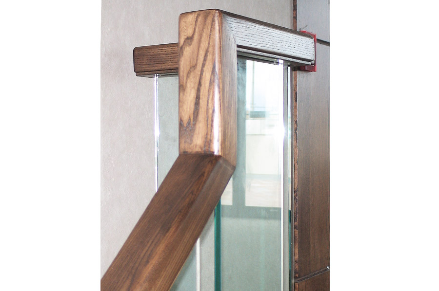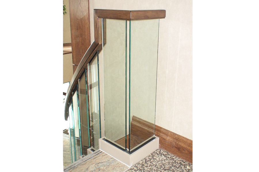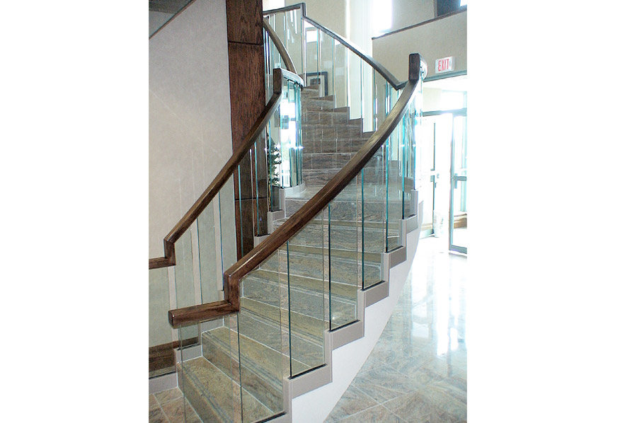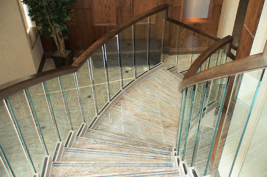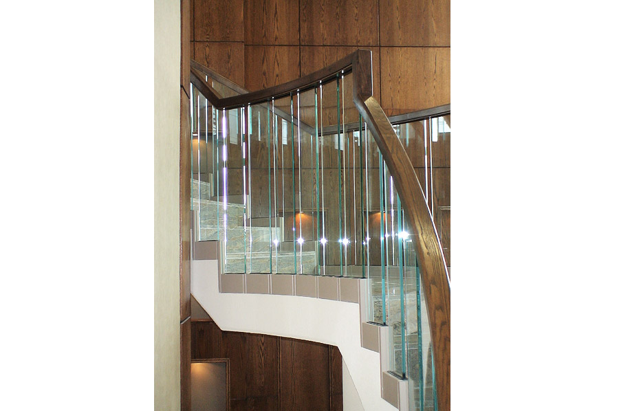 Highlights: The spiral railing design features faceted clear 1/2" thick tempered glass panels with polished edges and painted aluminum risers and shoes. The curved top rail was made from solid oak and stained to match existing wood trim and paneling.
