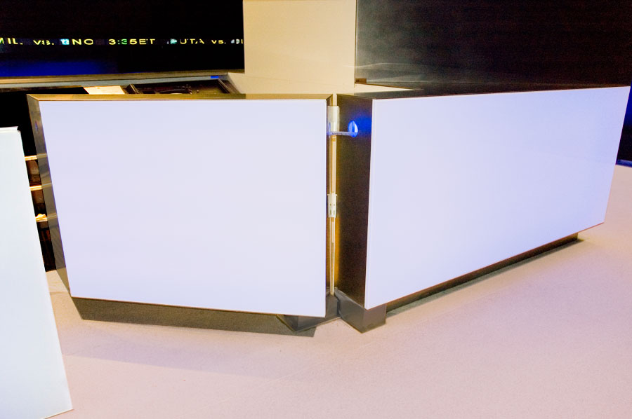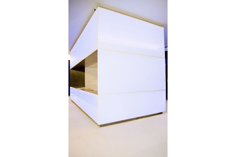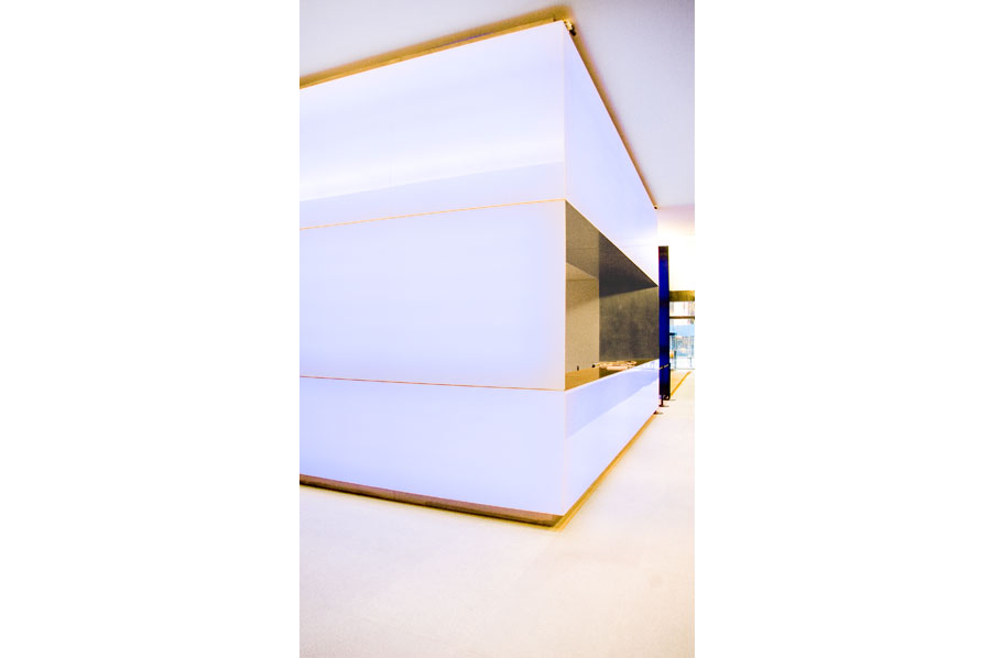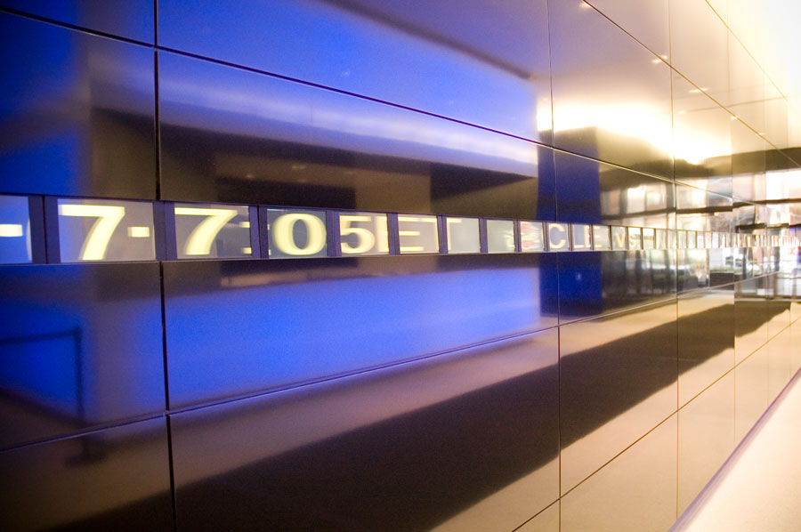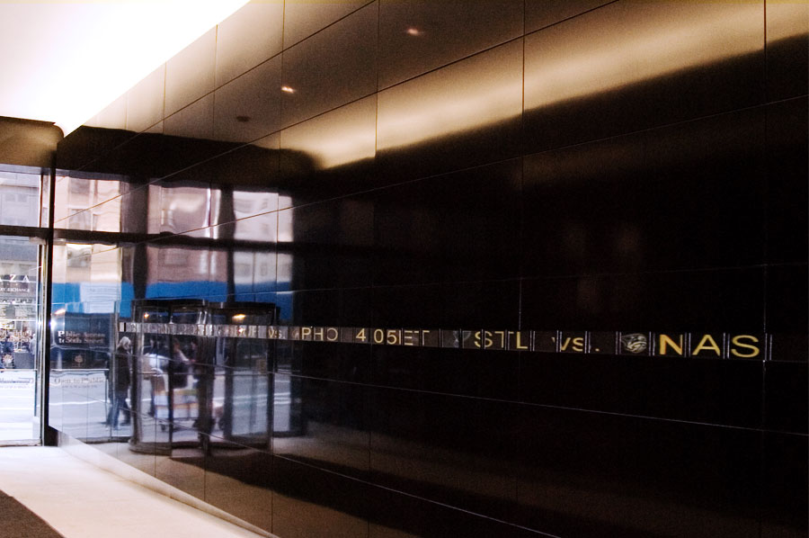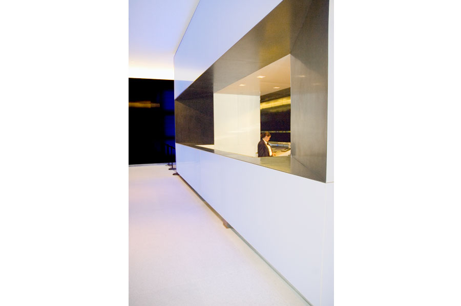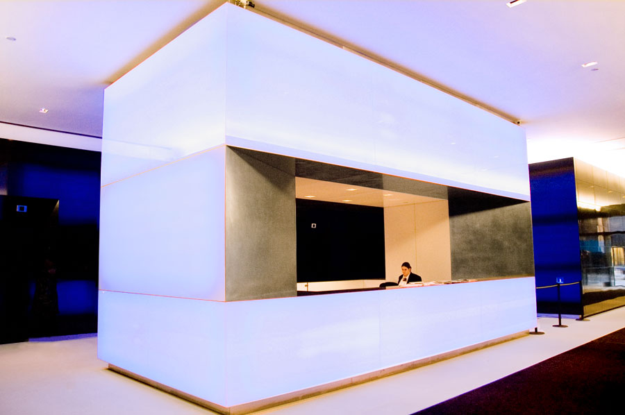 Highlights: Aluminum wall framing system is complete with .25" thick black painted wall panels with .25" wide x .25" deep, horizontal and vertical reveals, mounted to the framing system which is fastened to the existing wall finishes in the lobby. LCD stock ticker display runs the length of the wall opposite the reception desk. The reception enclosure is a stand alone white painted steel framing system with horizontally mounted brushed stainless steel bars at each course that supports structurally siliconed 9/16" low iron laminated translucent glazing panels on the outside faces with a back-lighting system of T5 fluorescent fixtures along with removable white painted aluminum panels including tamper proof screws on the inside wall and ceiling surfaces. Brushed stainless steel clad surfaces surround the transaction openings at both sides of the light box including the counter, ceiling panels above and the flanking diagonal panels.