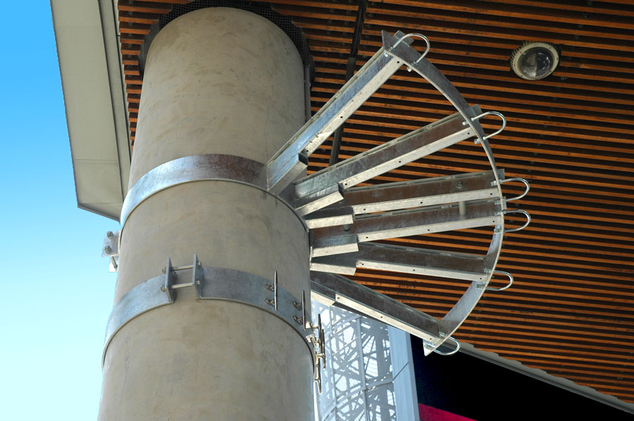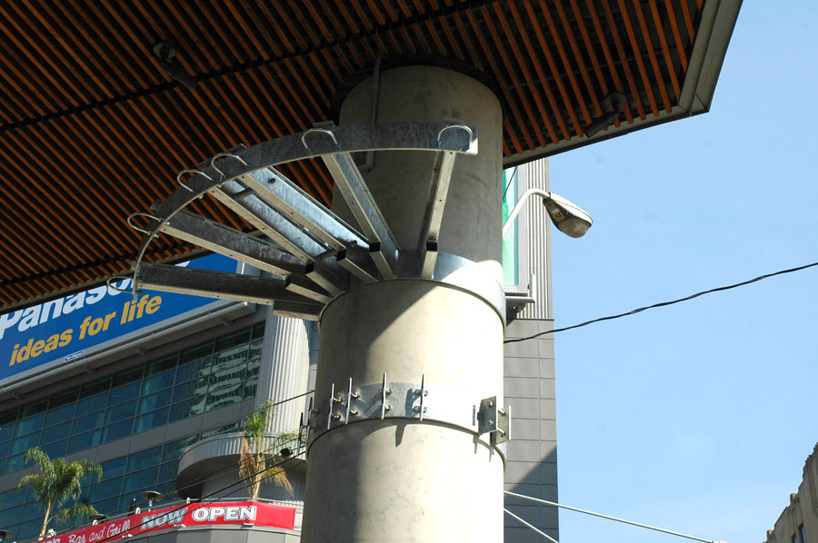 Highlights: Eleven (11) sets of upper steel column brackets with a galvanized finish and eleven (11) sets of 2 piece, rear lap jointed galvanized finish steel bottom rings. Top outer ring fabricated from 3/4" x 5" flat bar. These custom steel brackets were detailed, engineered, fabricated and installed within a four week timeline to satisfy the customer requirements. Galvanized steel was used due to the temporary nature of the installation as well as budget considerations. Were the installation permanent, Soheil Mosun Limited would have recommended utilizing exterior grade stainless steel; a more suitable choice from an esthetic and longevity perspective.