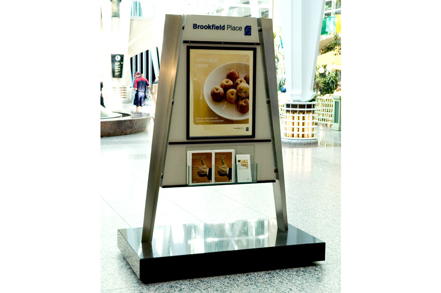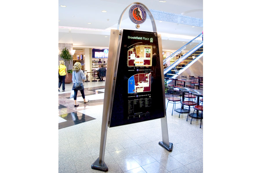 Highlights: These directories and signs are varied in materials and design to suit the location they are in, within the Brookfield Place office complex. Materials range from 1/4" stainless steel and tempered 1/4" glass inserts for the upright brochure holders and directories to modern molded plastics and aluminum for wayfinding signage.