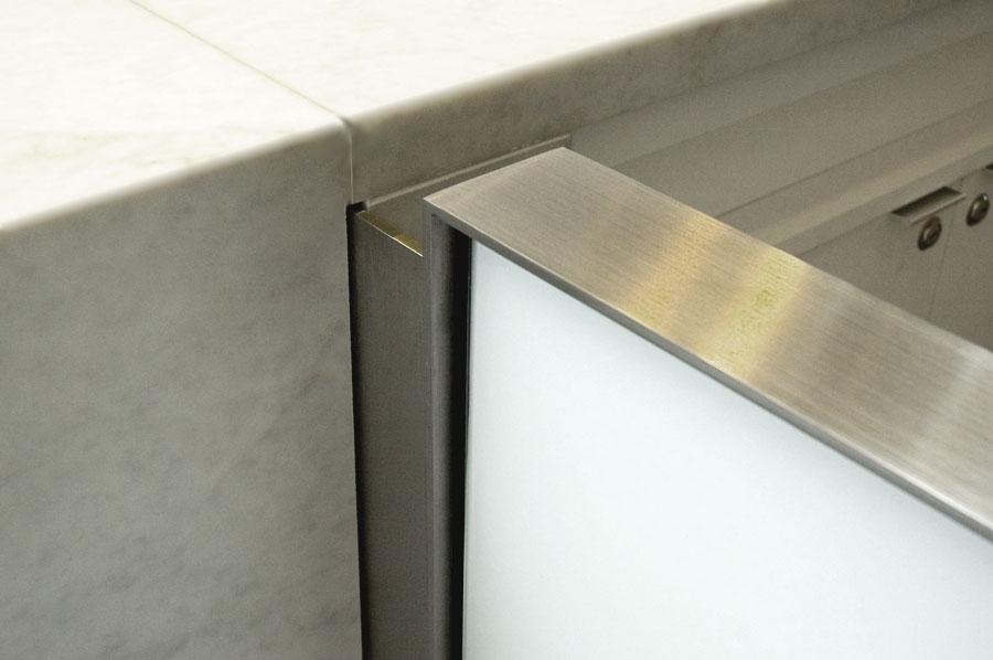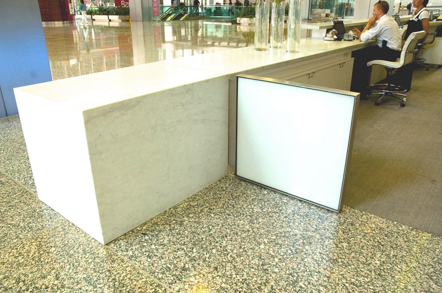 Highlights: The concierge desk is 60 feet long. The frame of the concierge desk is cold rolled steel tube welded and mounted to a 2" granite block above a 3 1/2" concrete slab. The marble is 3/4" slabs of Bianca Carrera. Alloy 304 stainless steel is used for all visible metal finishes. Lighting system is a programmable rgb led system seated behind starphire glass panels and reflected out using specular aluminum panels. The marble is polished to a satin finish and appears seamless overall due to the use of large continuous slabs wherever possible. The desk is the dominating feature of the atrium.