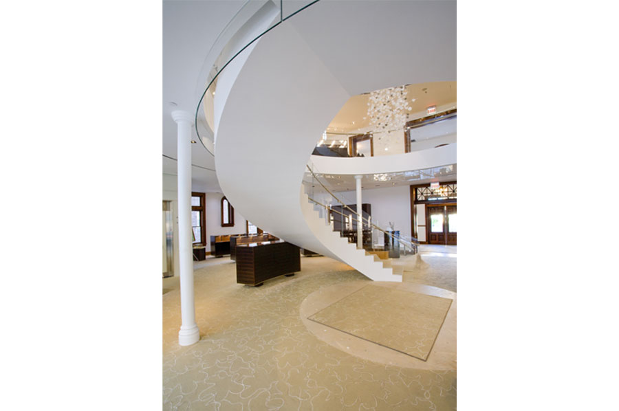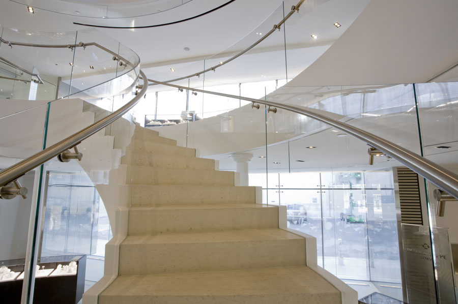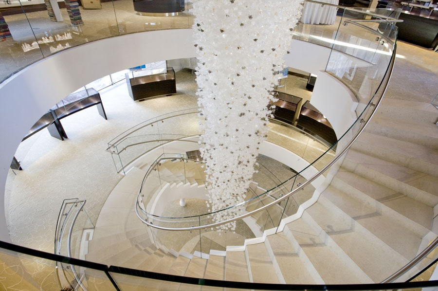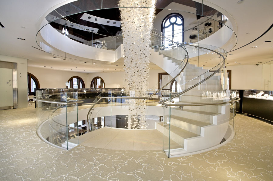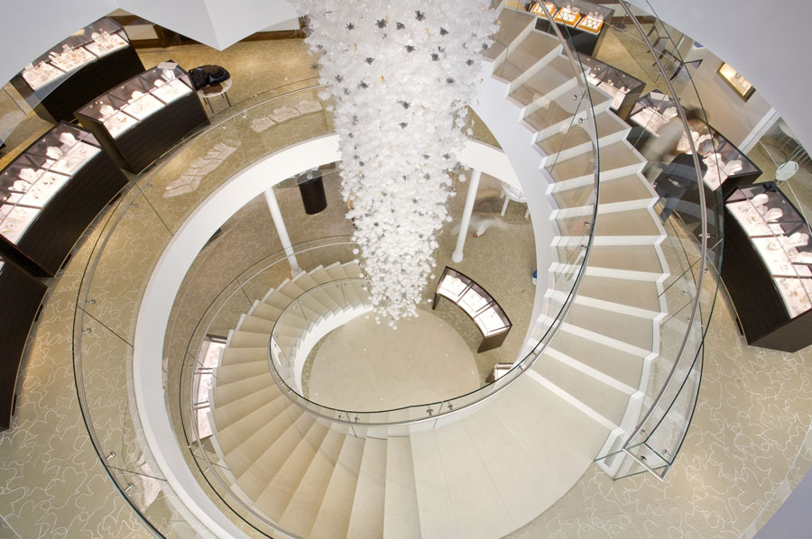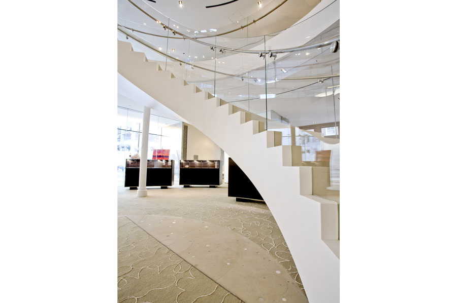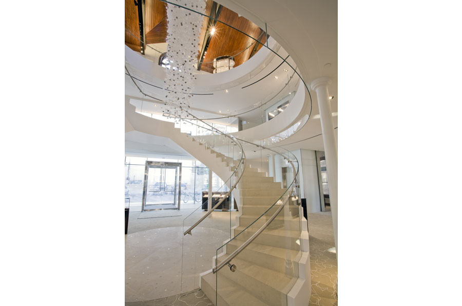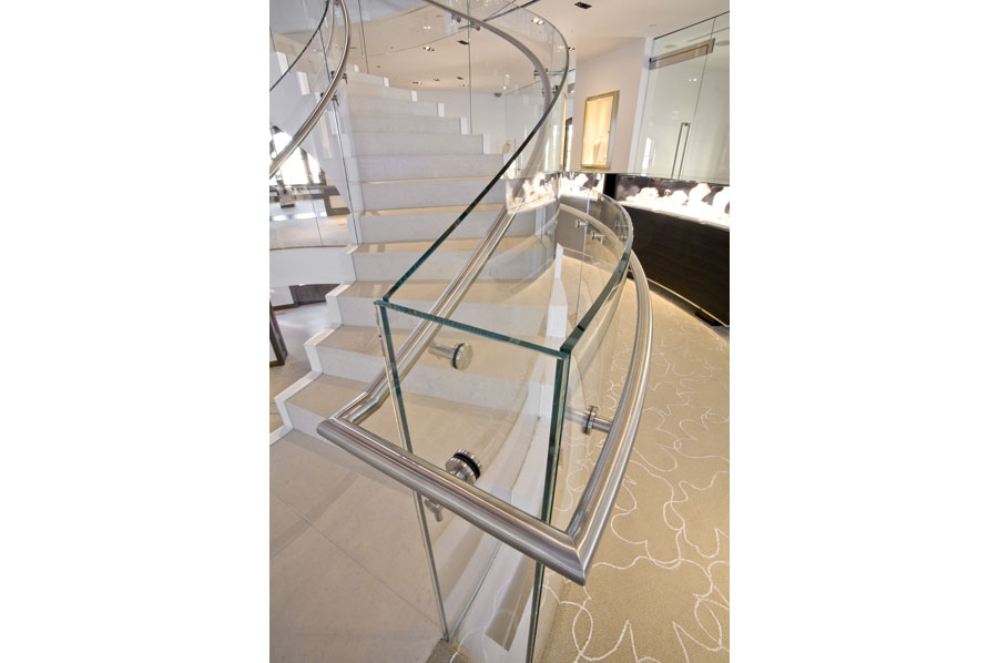 Highlights: Set in the center of the store, this staircase spirals in two continuous 180 degree half circles, through three levels to a height of 28'. The rolled and reinforced HSS primary stringer structure was engineered to support the substantial loads imposed by the 1 1/2" thick polished white limestone treads and risers, the seamless white plaster cladding at the edges and underside as well as the curved, tempered, Starfire glass guardrails. The matching balustrade glass and smoke baffle glass enclose the 16' diameter floor openings while the rolled, welded and seamless 1 1/2" diameter brushed stainless steel handrails and brackets provide support and continuity.