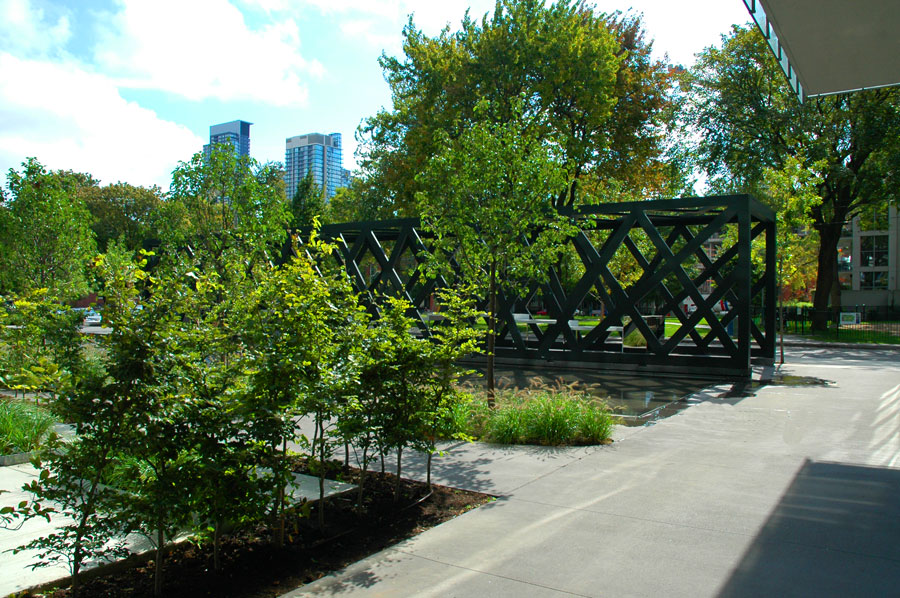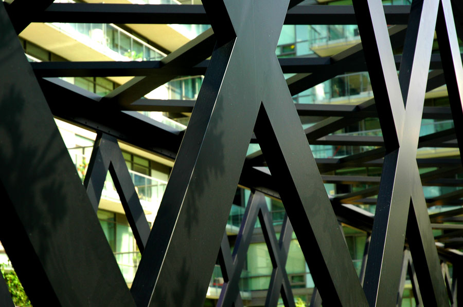 Highlights: The trellis pavilion is composed of 10" x 3' aluminum square tube which has been welded seamlessly and powder coated a matte black. The overall length of the trellis pavilion is 73'-6" with a height of 12'-6" and a width of 12'-6". The trellis pavilion is a part of the condominium's public art offering and is an integral part of the landscape design theme.