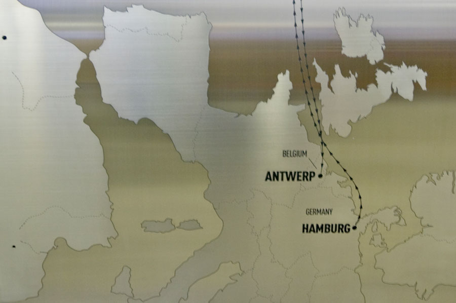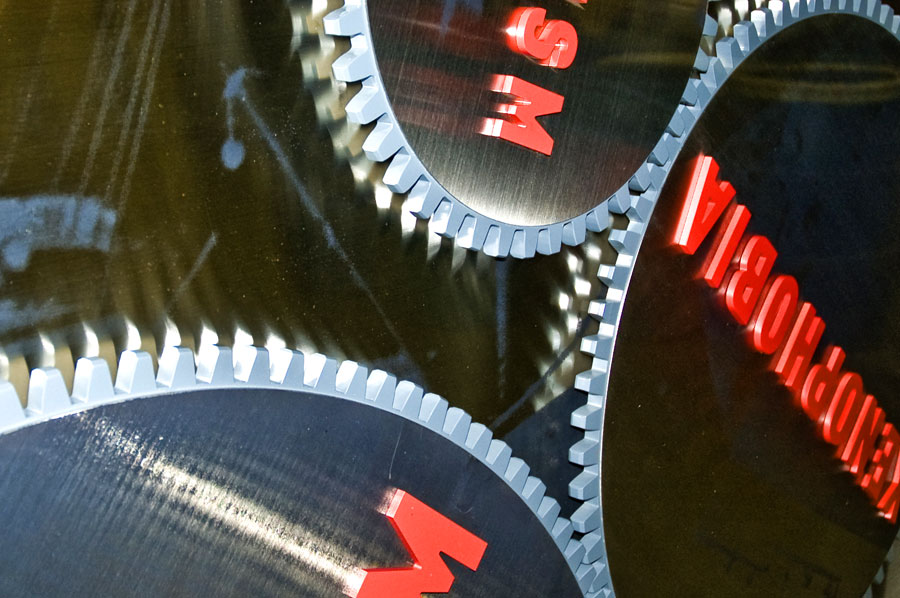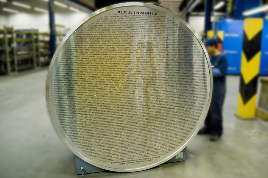 Highlights: The stainless steel clad, laser etched wheels on the face of the monument are turned by gears, which are symbolic of the ship's gears. On the rim of the large wheel is the description of the tragedy of the M.S. St. Louis. It is surrounded by an etched map of the world displaying the ship's route on the cylinder. On the reverse side of the memorial are etched the names of all the passengers. The monument is built up from a 1/2" x 1/2" steel tube frame with heavy duty electric motors mounted and shaft connected to the internal 3" thick anodized aluminum gears. The exterior shell is 1/16" thick stainless steel that has the Soheil Mosun Limited specialty combo finish and is acid etched. The front artwork is a laser etched reproduction of an original photograph of the M.S. St.Louis. The entire front piece is glazed with 3/8" thick glass protecting the gears.