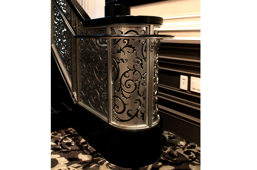 Highlights: The monumental staircase features custom sculptured steel guard panels with ornamental floral design, stone treads and risers, and custom newel posts. The steel guard panels are painted silver for an ultra long lasting finish. Railings are stainless steel and the main staircase is mechanically fastened to the outside wall's infrastructure ensuring stability and strength for the lifetime of the staircase.