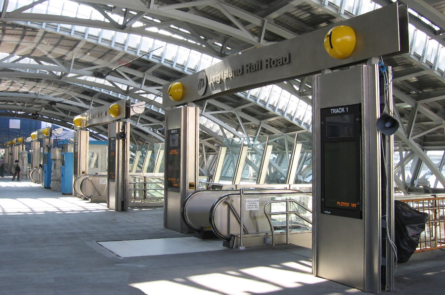 Highlights: Girders made out of solid 1/2" thick stainless steel plate measuring 23 feet x 2 feet complete with 1/2" thick solid stainless steel logo/letters and track identifier on spun and painted metal globe all pinned mounted with concealed fasteners to curved surface of girder. 10'-0" high column structures consists of carbon steel support structure with stainless steel cladding incorporating LED signboard within the column. All T316 stainless steel components were finished with non-directional orbital finish.