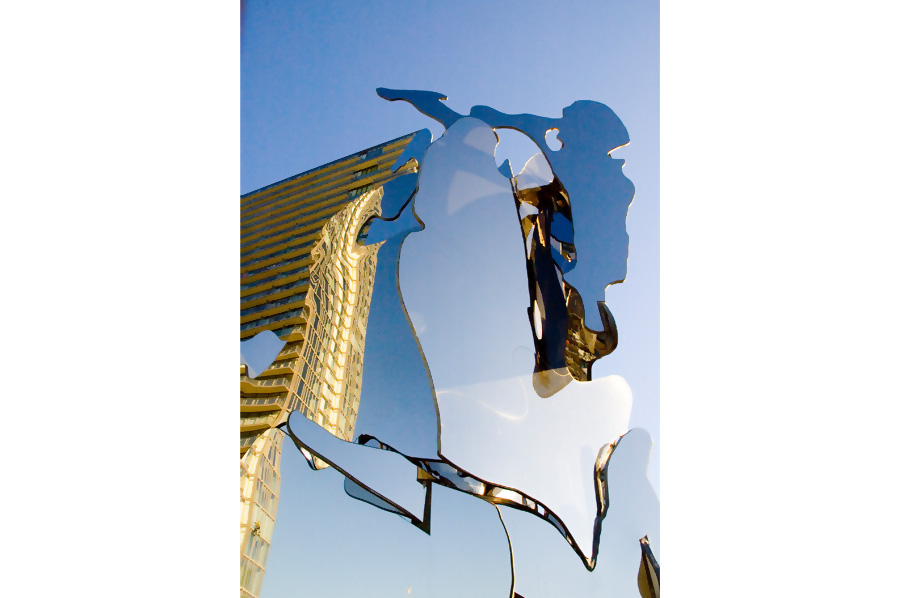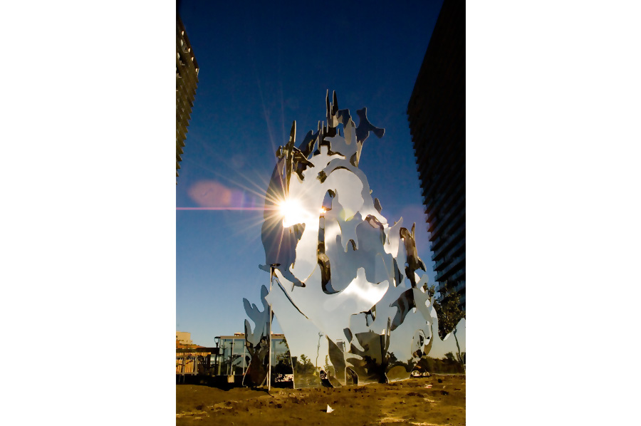 Highlights: This sculpture stands approximately 30 feet tall and is approximately 18 feet long and 10 feet wide at the base. The galvanized core of steel is 1/2" to 3/4" thick and consists of multiple irregularly shaped parts welded and clad with 16 gauge, 316 alloy stainless steel with a mirror polished finish. The entire sculpture is mounted to a reinforced concrete base complete with structural gusset plates.