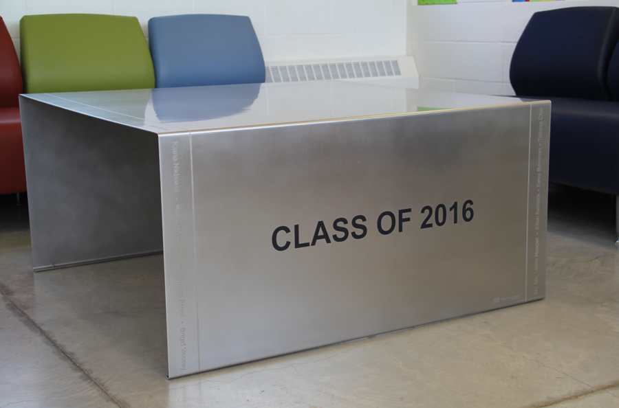 Highlights: The table is 1/8" alloy 304 stainless steel in a single piece, formed, then etched, infilled and orbital brush finished. It has the etched names of all the students and teachers for the graduating class of 2016 around the delineated border of the table, separated by etched dots and within an etched border. The table is 48" square and 23.5" in height. The letters are 2 1/2" high on the main text "Class of 2016" and the school logo is 6" wide and approximately 8" in height, etched and infilled in the schools deep blue colour.