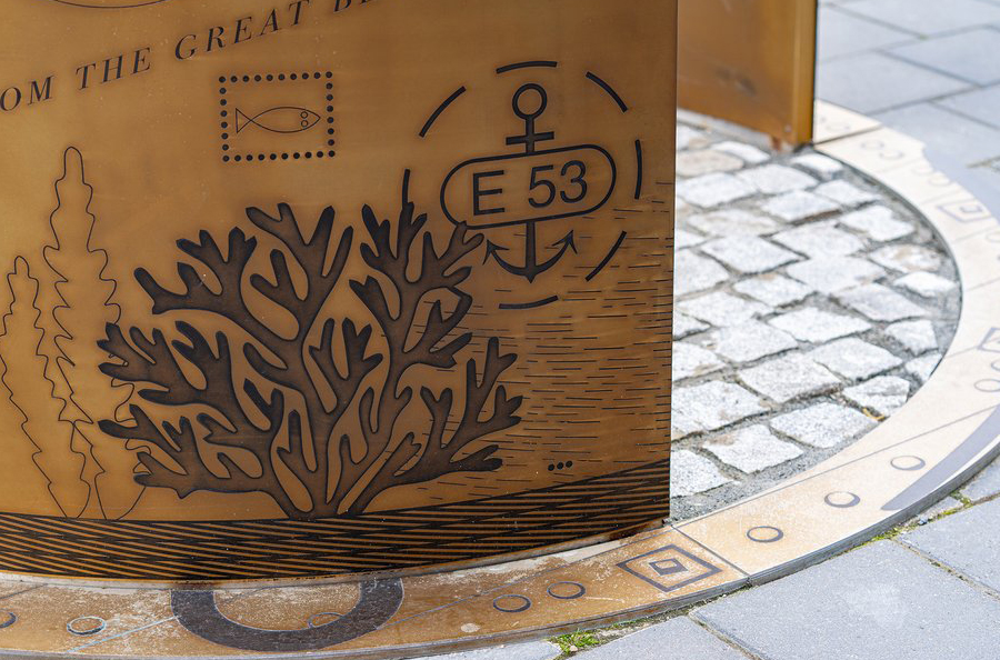 Highlights: The two (2) vent spools and one (1) pause spool, have stainless steel welded framing within for enduring support. All spools are 1/8” thick muntz panel with etched and patinated graphics depicting historical aspects of the Spool Yard. At the base of the spools are 3/16” thick muntz inlay with etched and patinated graphics attached to 1/4” thick stainless steel baseplates. The Ghost spool is 3/16” thick muntz with etched and patinated graphics. The standing spools include LED raceways for lighting by others.