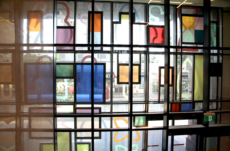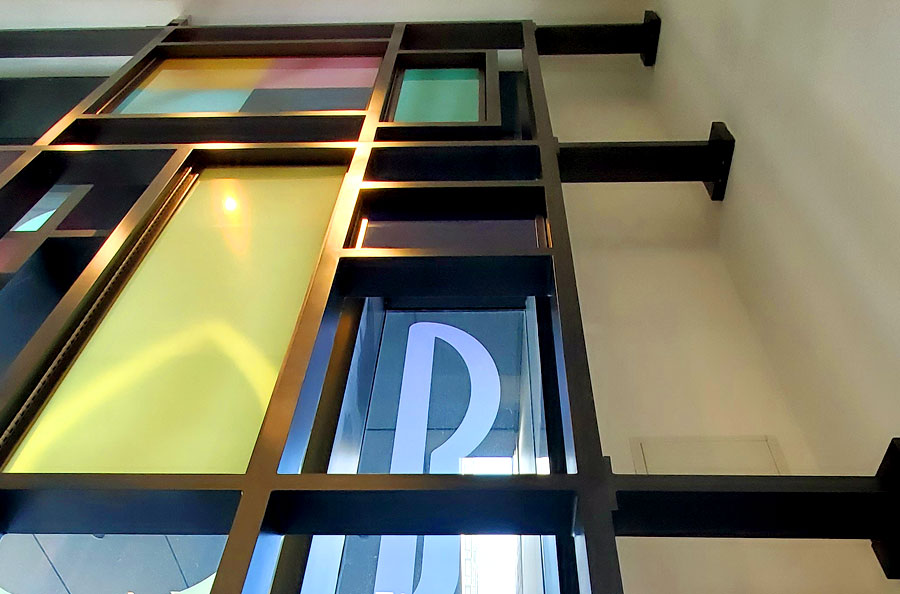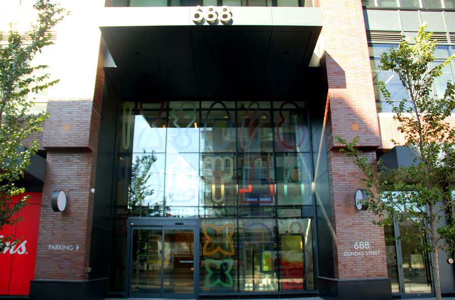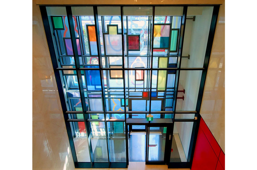 Scope: Soheil Mosun Limited was commissioned to manufacture design, supply and install this large work of public art titled “Artworks Tower” at 688 Dundas Street in Toronto. The sculpture is located within the main entrance to the building in a wall to wall, ceiling to floor, coloured glass and painted metal framework.