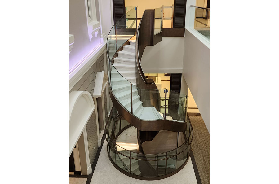 Highlights: Structural steel staircase clad with SML-C3 patinaed muntz bronze inside and outside of stringers. 168’ of railings are patinaed bronze and secured with custom built fasteners secured to posts and glazing. Structural steel components were 3D modeled and templated in shop and shipped to Bermuda for installation. Cladding is .050” Muntz Bronze cut and formed to the staircase. Stone treads and risers are comprised of white marble.