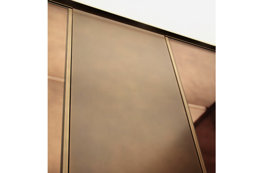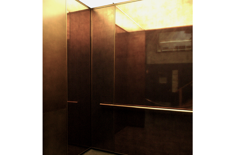 Highlights: The elevator interiors feature acid etched laminated glass wall panels with antique bronze reverse painted finish, laminated to honeycomb aluminum. The glass emulates the bronze cladded door, COP and front return panels, which are all patinated to an architecturally approved finish, then coated with a matte lacquer. The ceiling panels are fabricated 1/4” acrylic removable pans. Hand rails are orbitally finished, then patinated and lacquered.