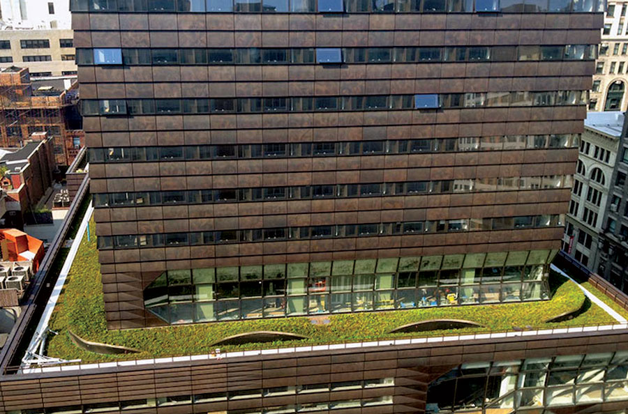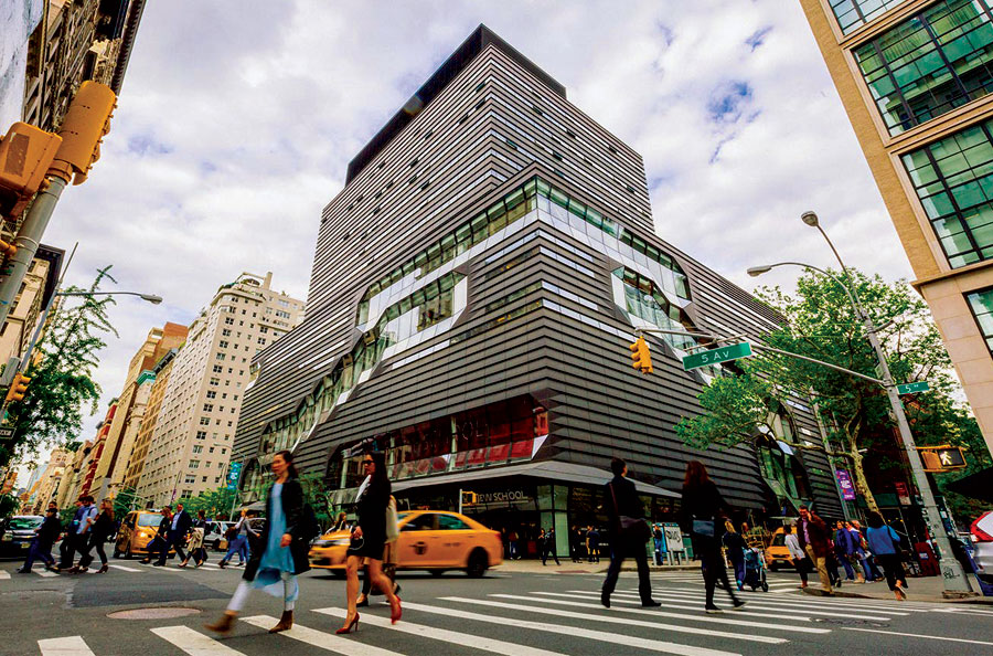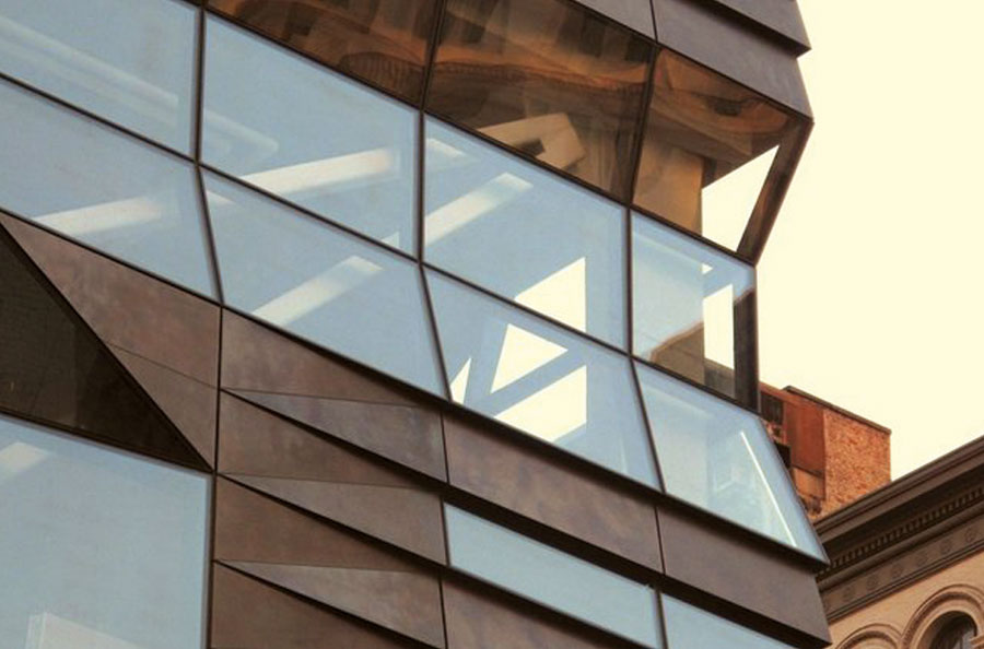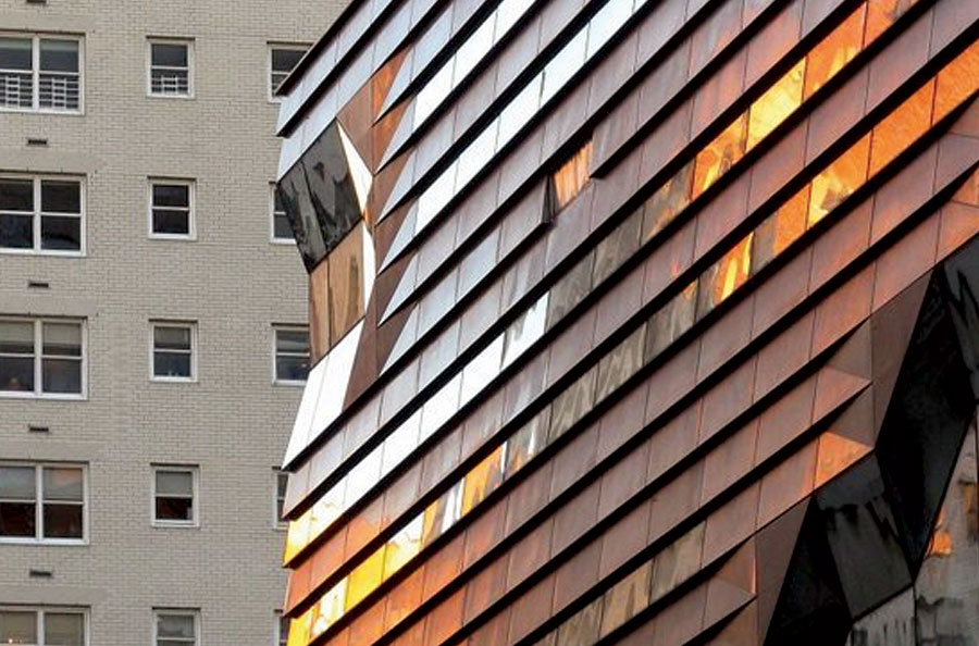 Scope: Soheil Mosun Limited was contracted to patinate thousands (approx 7500) of muntz bronze panels which comprise the cladding of the (16) story building envelope at The New School, in New York City, located at 65-5th Ave.