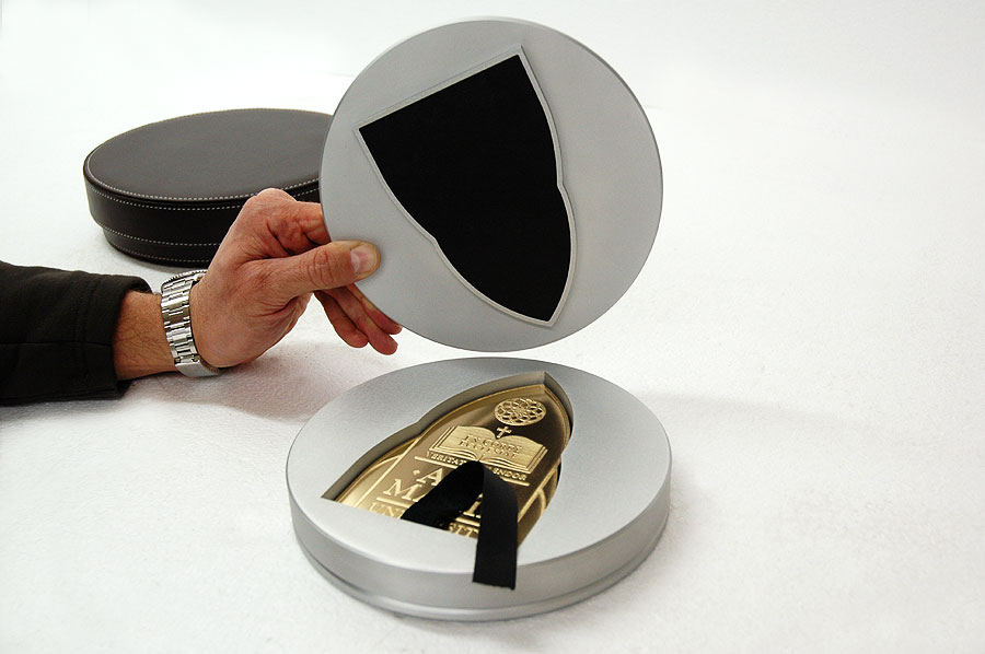 Highlights: This exquisite custom piece was waterjet cut from 1/2" thick solid bronze plate. The logo on the front was acid etched, while the inscription on the back of the paperweight was engraved using the three-dimensional machining centre. The final process was 24-karat gold plating. The accompanying metal holder was machined from a solid block of aluminum and features a beautiful watermark etched crest and gold plated feet, all complimented with a striking handmade leather carrying case.