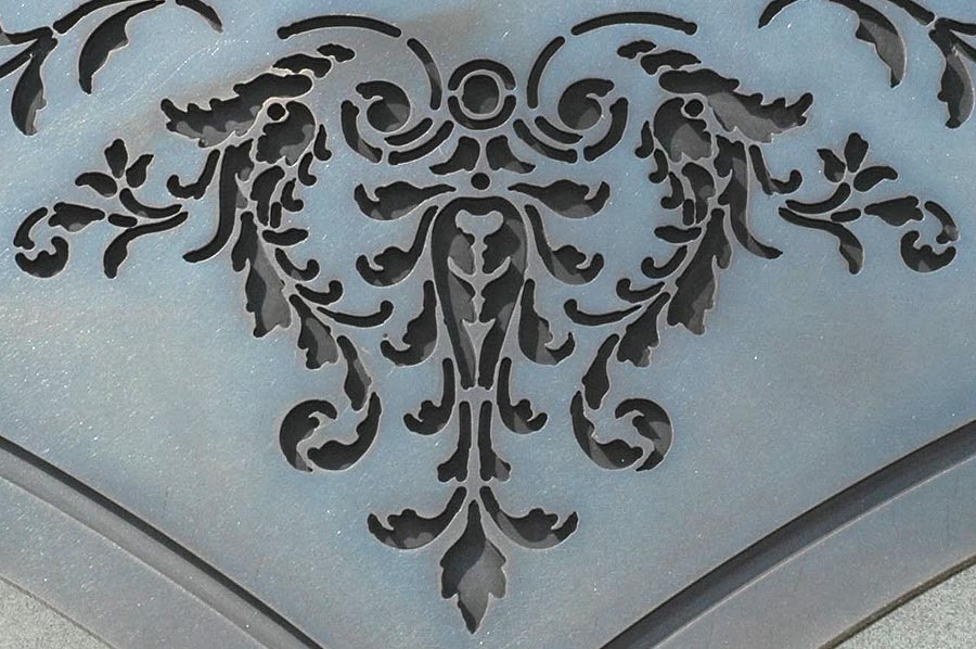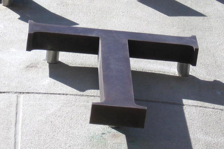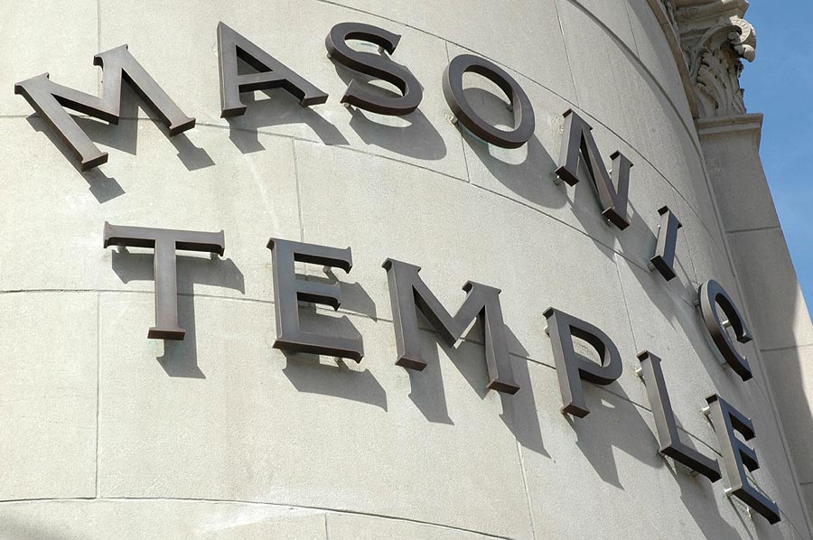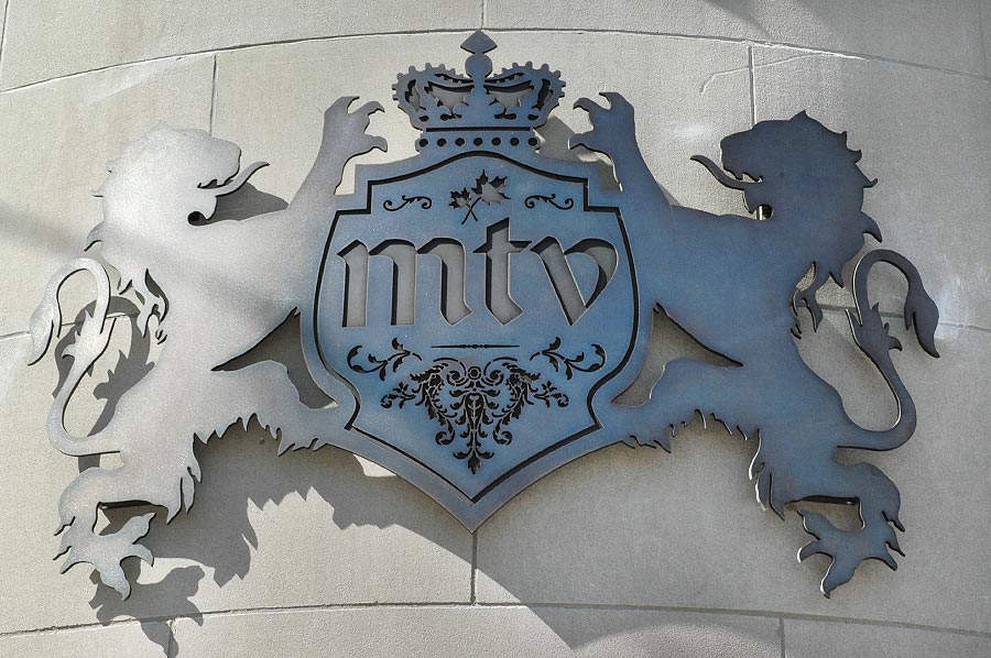 Highlights: The temple name, replicating the original sign letters in size and position on the prominent curved corner of the building, was waterjet cut from 1" muntz bronze. The MTV crest and logo was waterjet cut from 1/4" muntz bronze, engraved with our 3DMS and rolled to match the curvature of the building. Both the letters and crest were pinned mounted off the face of the building. The wall sconces, fabricated from 1/8" muntz bronze, were rolled and machined to a size of 18" tall and 9" in diameter. All of the bronze was finished in a dark statuary patina finish with no sealer. The bronze will continue to darken over time and attain an historic finish.