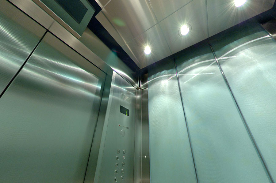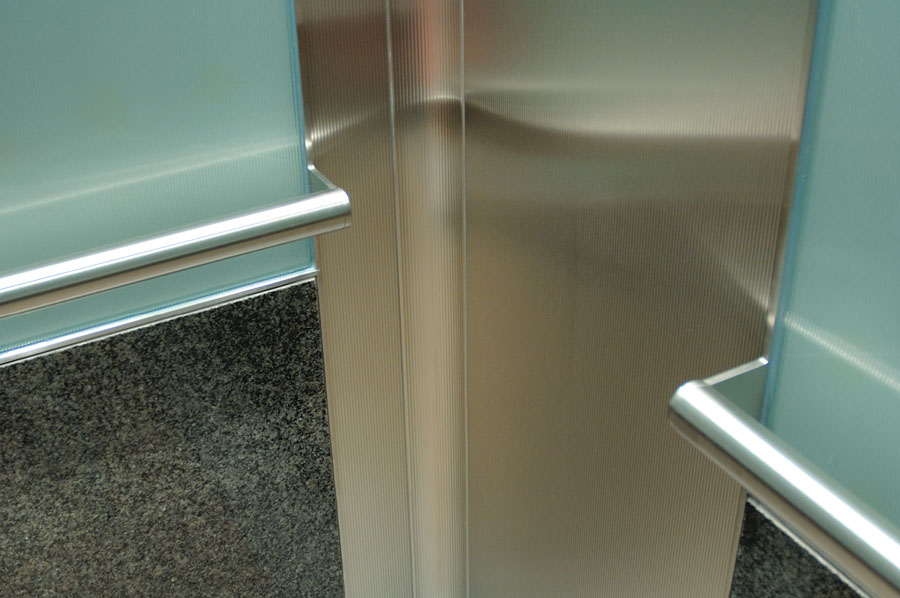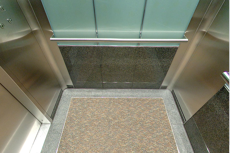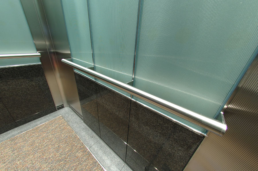 Highlights: Elevator interior walls feature back-painted reeded tempered glass, and rigidized st. stl. COP panels complimented with etched specification plates and illuminated call buttons. Ceilings feature exquisite brushed st. stl. and recessed pot lights. Transom panels are integrated with 'Captivate Network' ready monitors and hidden security cameras. The cab also boasts st. stl. handrails with no visible fasteners, granite wall and floor panels with inlay carpeting.