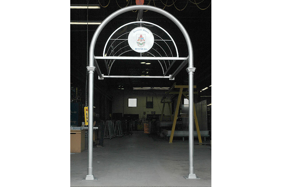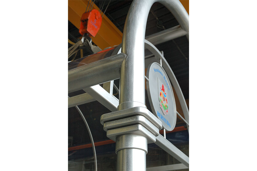 Highlights: The canopy is made of 316 St. Stl. alloy with orbital brushed finish and glazed with 3/8" thick rolled Lexan panels using minimal fasteners. The front of the canopy is accented with a complex, waterjet cut, etched and multi-coloured infilled crest on a suspended St. Stl. plate. The structure was designed to withstand varying Bermuda weather conditions.