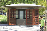 Bosque Kiosk - (2) Custom Oval-shaped exterior food service kiosks, 20 feet long, fabricated from Jatoba wood, glass and stainless steel.